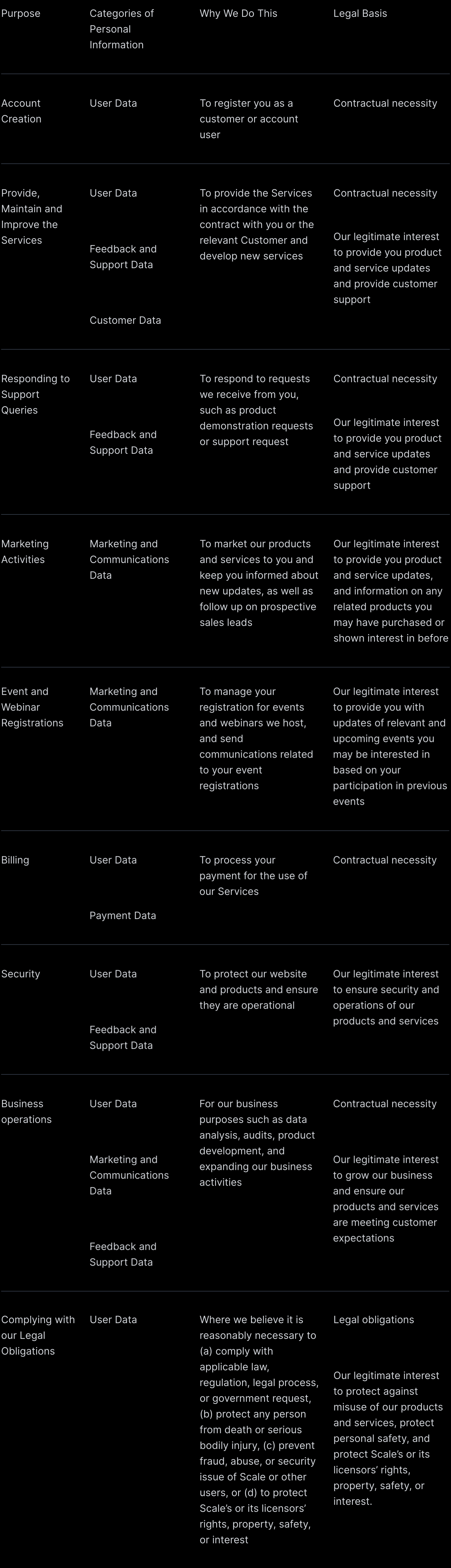This policy describes how Scale collects, uses, shares or otherwise processes information relating to individuals and the rights associated with that processing. A reference to “Scale,” “we,” “us” or the “Company” is a reference to Scale AI, Inc. and its affiliates involved in the collection, use, sharing, or other processing of personal information. Where applicable, Scale AI, Inc. is the controller.