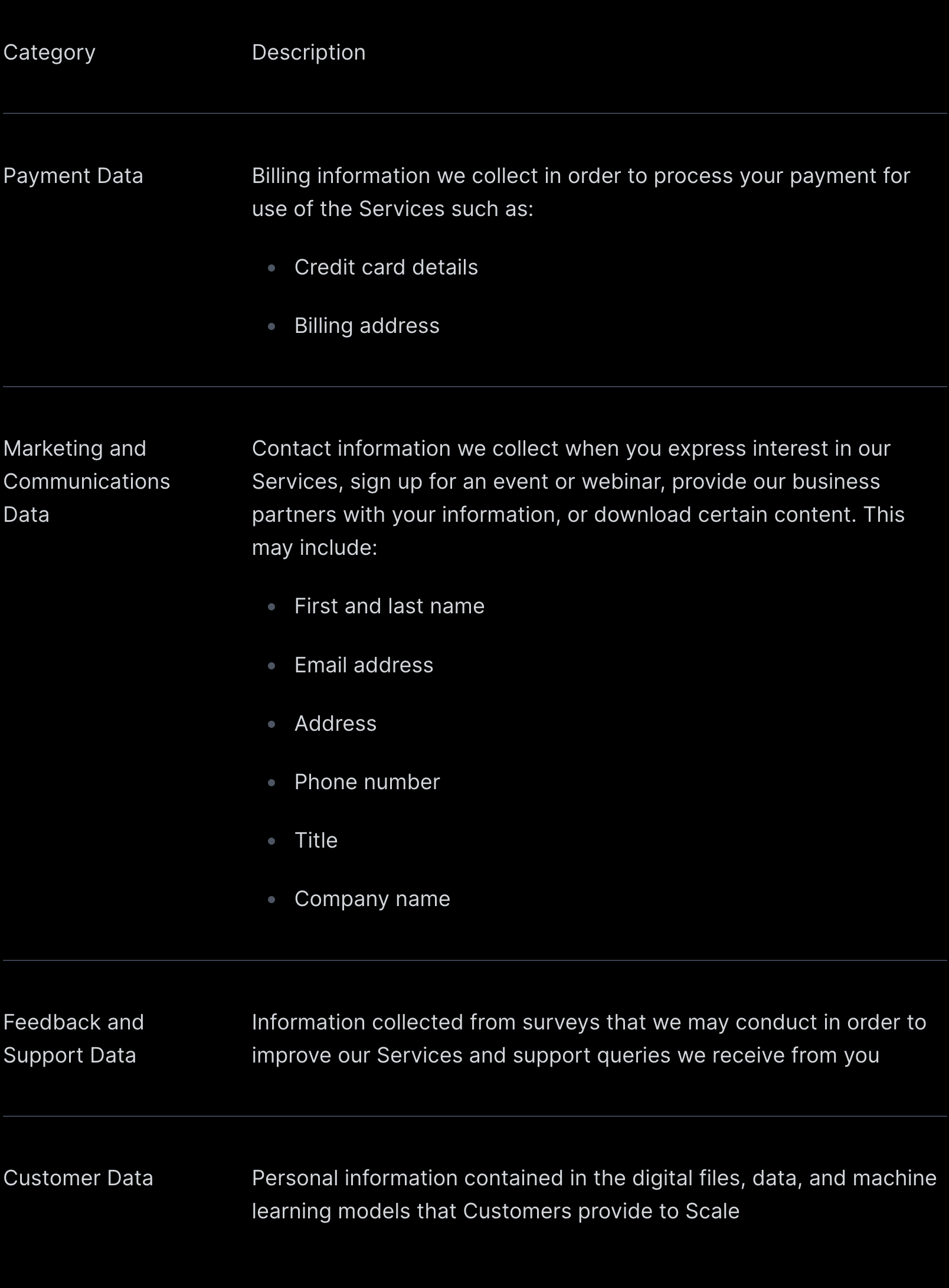This Privacy Policy applies to the personal information we collect when you use our websites (such as www.scale.com) and our products, services, and applications (collectively, the “Services”), when you attend a Scale event, or otherwise interact with us.