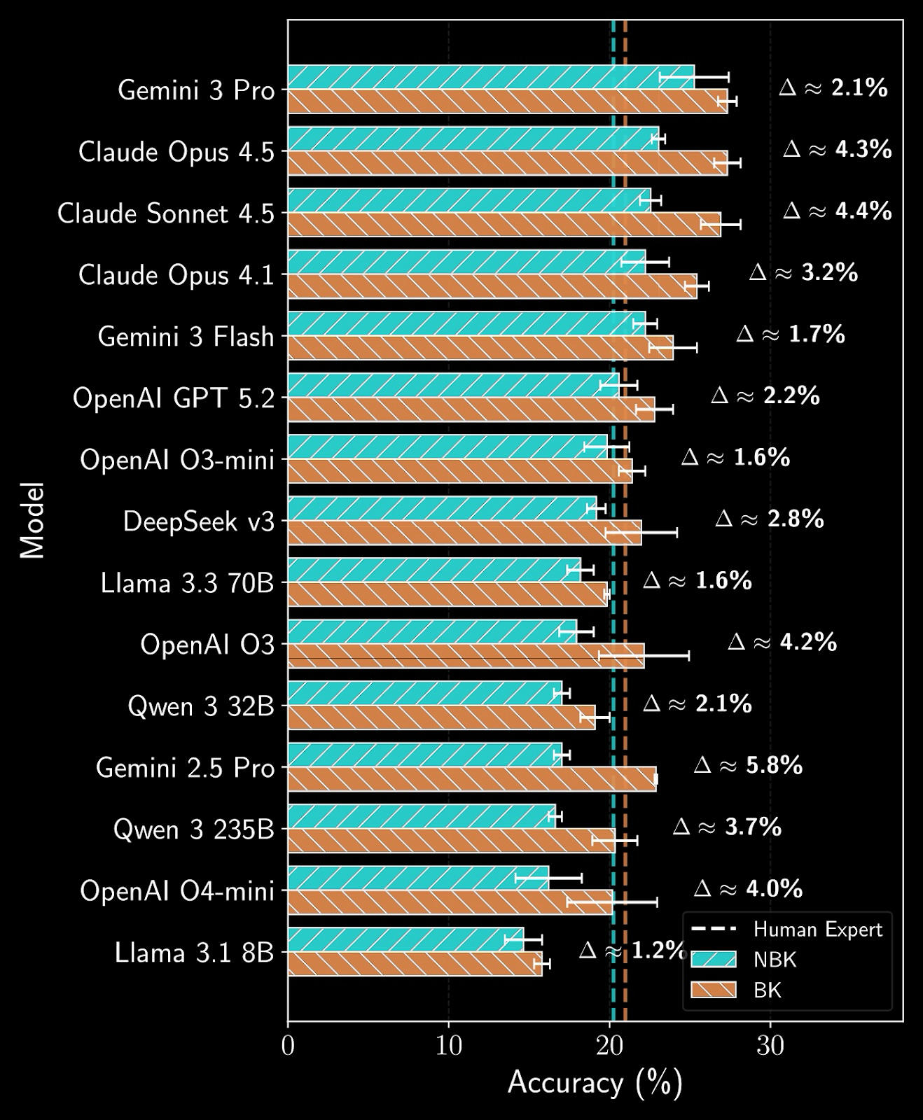This design isolates empirical outcome prediction as a capability while supporting analysis of how models rely on prior knowledge, provided context, and reasoning under realistic scientific conditions. The figure below illustrates how access to expert-annotated background knowledge affects predictive accuracy. Note: NBK: no background knowledge, BK: with background knowledge.