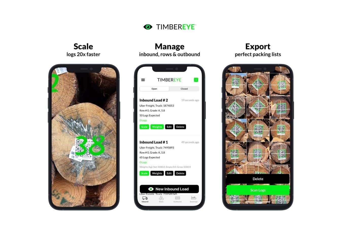 Lumber prices rose drastically during the Covid-19 pandemic. Even as timber supply remained steady, lockdowns or work-from-home orders slowed lumber processing at sawmills. With market price fluctuations, measuring the weight, dimensions, and quality of lumber became more important than ever before. Measuring, or scaling lumber has historically been done manually. Manually scaling lumber is a dangerous process, requiring individuals to work in environments where logs are piled high and people and heavy machinery must work in close proximity. TimberEye provides a mobile application that leverages the latest in computer vision and LiDAR mapping technology to enable lumber suppliers as well as buyers to categorize and scale logs up to 20x faster, more safely and consistently, and with better accuracy.